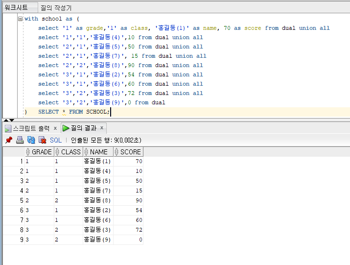 select '1' as grade,'1' as class, '홍길동(1)' as name, 70 as score from dual union all