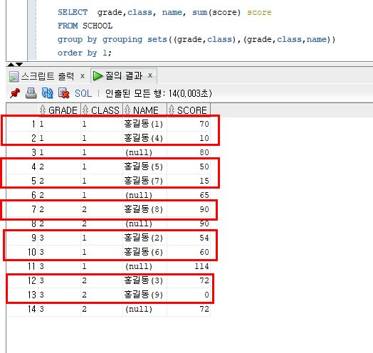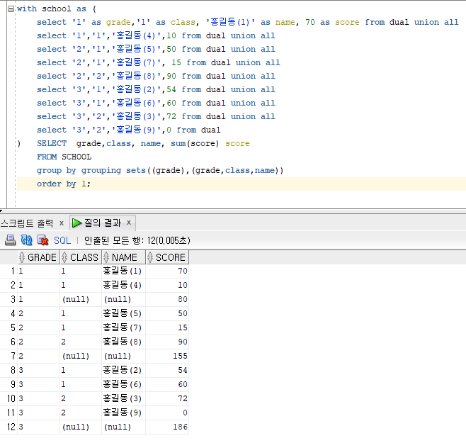 grouping sets에서 명시해 준 grade와 class가 같은 데이터들!의 select 절에 있는 sum의 결과를 보여준다.