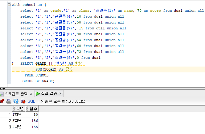그리고 점수는 합계를 내야 하기 때문에 SELECT 절에 합계함수 SUM으로 SCORE을 감싸준다.