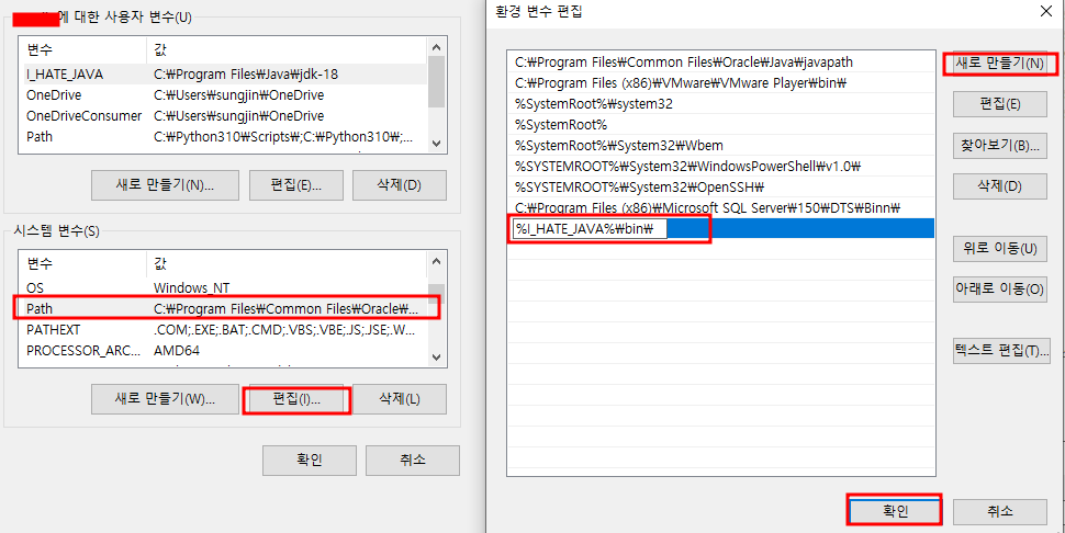 3. %I_HATE_JAVA%\bin\ --> Path에 I_HATE_JAVA (경로)를 추가하고, 경로 밑에 bin 폴더 경로를 잡아줍니다