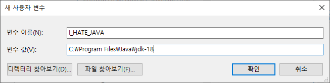 확인 눌르면 I_HATE_JAVA라는 변수를 내가 만들었고, 그 값은 JAVA설치된 경로를 제가 설정 한겁니다.